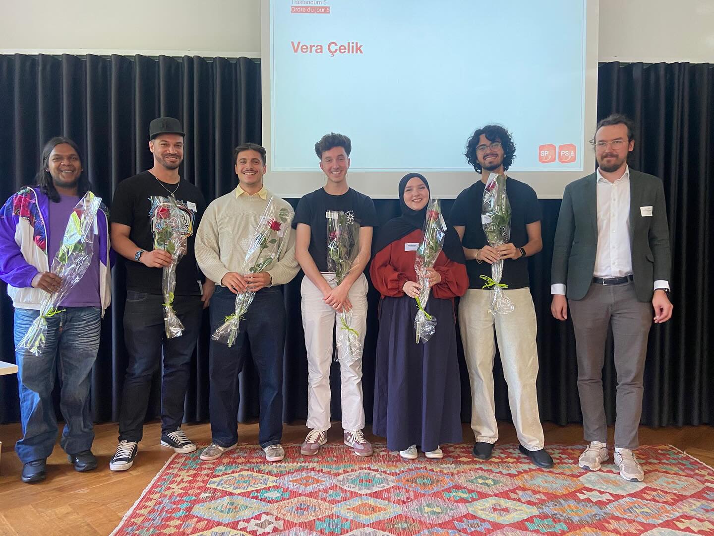 La nouvelle direction du PS Migrant-es Suisse (de gauche à droite) : Athushan Thavarajasingam, Halua Pinto de Magalhães, Gazmendi Noli, Benjamin Ferizaj, Vera Çelik, Alişiyar Sürensoy et Reis Luzhnica (coprésident). Non visible sur la photo : Sinem Gökçen (coprésidente) und Samson Yemane