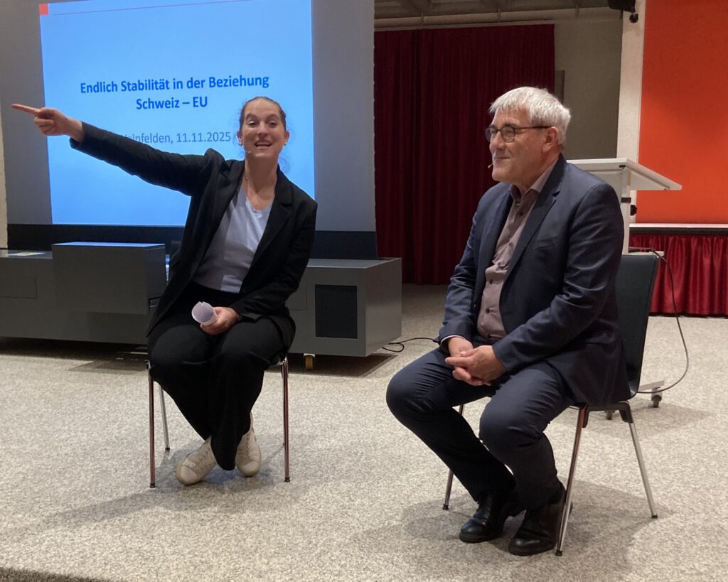 Après la brève assemblée constitutive, le PS60+ Thurgovie a proposé un programme passionnant. Une soixantaine de personnes intéressées ont accueilli le conseiller national Eric Nussbaumer, originaire de Liestal, dans le canton de Bâle-Campagne, à Weinfelden. La conseillère nationale Nina Schläfli, de Kreuzlingen, a ouvert cette partie de la soirée par une conversation informelle avec Eric Nussbaumer. Ce dernier a avoué qu’il n’était pas souvent descendu du train à Weinfelden, mais qu’il était très heureux d’avoir été invité à cette soirée. Membre de la Commission de politique extérieure depuis 2013, il a participé à chaque étape et connaît donc très bien le dossier de l’UE.
